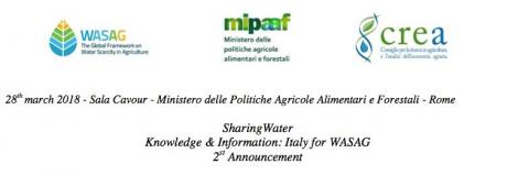 For 2018, the overarching theme of the 8th World Water Forum is “Sharing Water” that implies: sharing of ideas among civil society; sharing of the best practices and solutions; sharing the benefits of rational water use and; more broadly, sharing actions and responsibilities among nations. For these reasons it is proposed to share this important framework during the meeting on "Sharing Water, Knowledge and Information: Italy for WASAG".