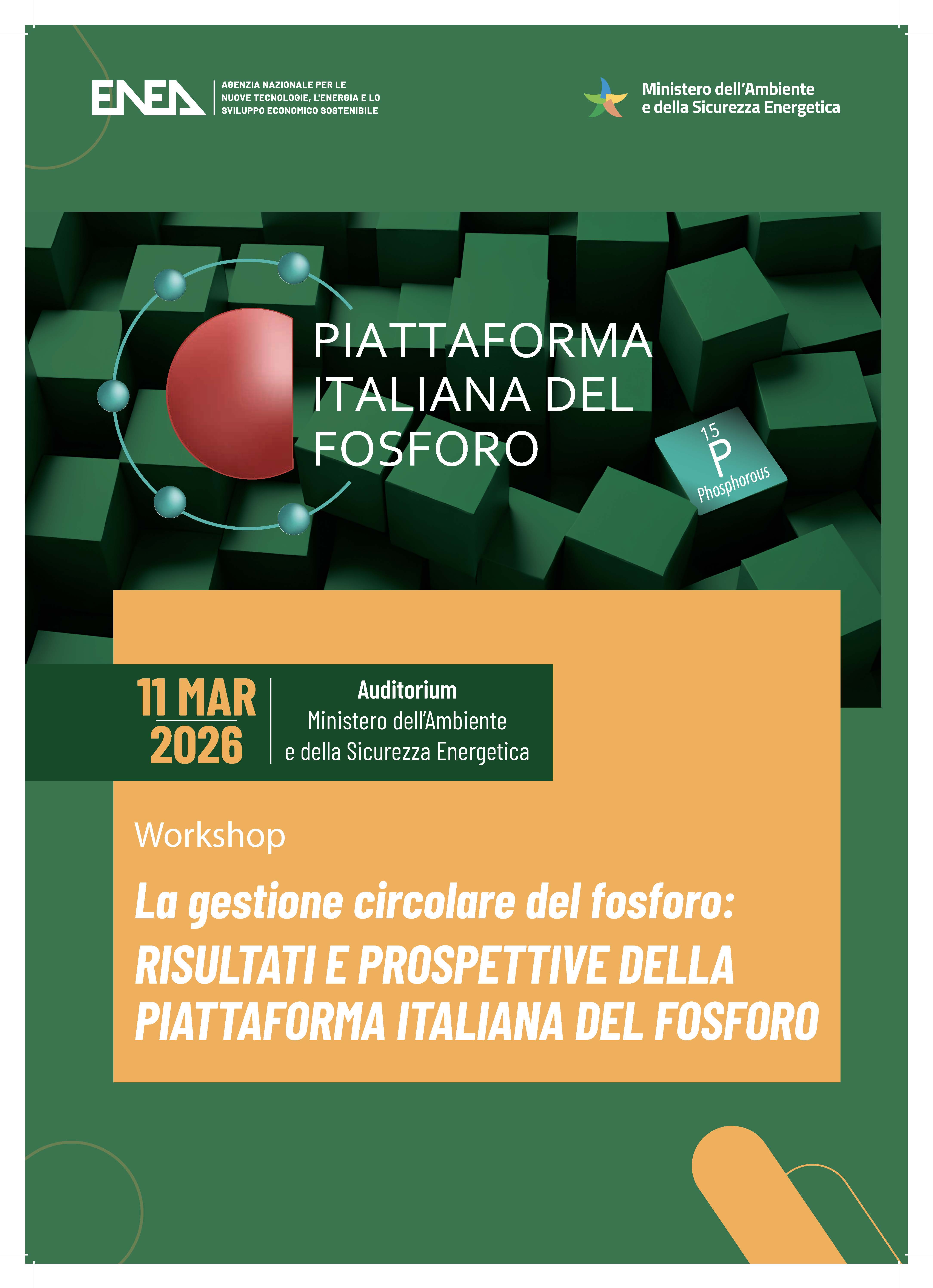 Nell'ambito della Piattaforma Italiana del Fosforo, ENEA organizza, in collaborazione con il Ministero dell’Ambiente e della Sicurezza Energetica, un workshop nel corso del quale saranno presentati i risultati ottenuti dalla Piattaforma nell’ultimo anno di attività, con particolare riferimento a buone pratiche e tecnologie, situazione normativa e mercato secondario del fosforo.