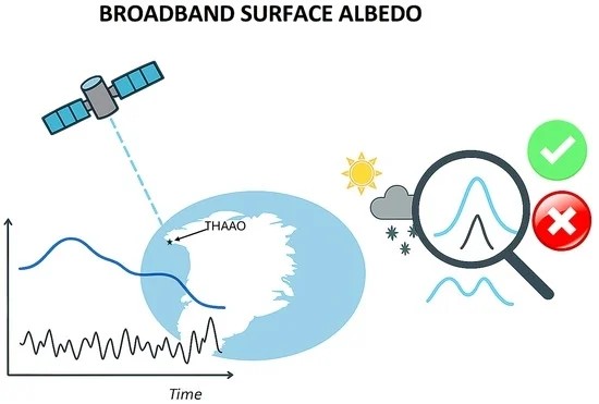 L'albedo superficiale, α, è uno dei parametri climatici chiave poiché regola la radiazione a onde corte assorbita dalla superficie terrestre. Una determinazione accurata dell'albedo è cruciale nelle regioni polari a causa delle sue variazioni associate ai cambiamenti climatici e del suo ruolo nei meccanismi di feedback forte. In questo lavoro[1], vengono confrontate le misurazioni satellitari e in situ dell'albedo superficiale a banda larga presso il Thule High Arctic Atmospheric Observatory (THAAO) sulla costa nord-occidentale della Groenlandia (76,5°N, 68,8°O). L'analisi, pubblicata sulla rivista Remote Sensing è interessante per vari motivi: data la scarsità delle misure artiche, i dati MODIS (che fornisce valori giornalieri) sono molto usati, ma a causa della frequente alta copertura nuvolosa e della variabilità delle condizioni nelle inversioni satellitari ci sono molte informazioni ricavate con sistemi indiretti.