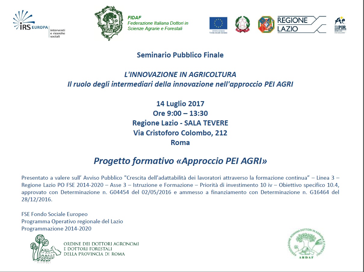 Il prossimo 14 luglio alle ore 09:00 si terrà presso la Sala Tevere della Regione Lazio (Via Cristoforo Colombo, 212 – Roma) il seminario Pubblico Finale: L'INNOVAZIONE IN AGRICOLTURA - Il ruolo degli intermediari della innovazione nell'approccio PEI AGRI.