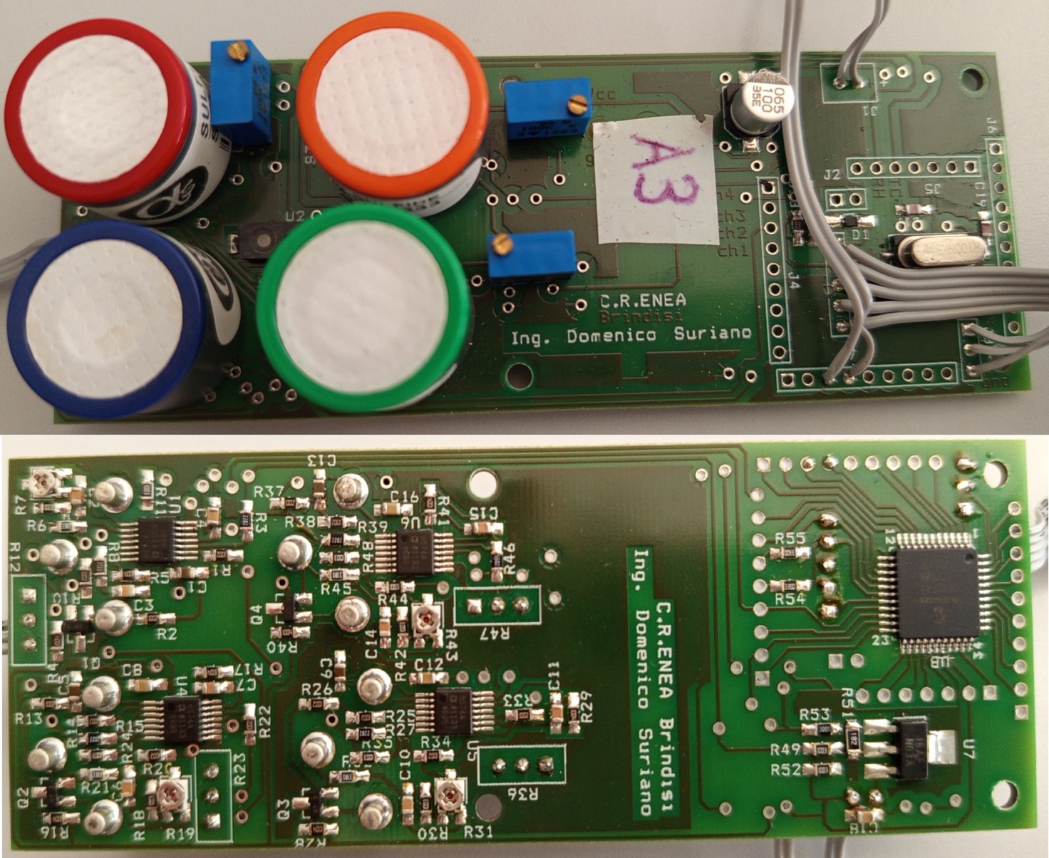 I sensori elettrochimici per gas costituiscono un alternativa a basso costo per il monitoraggio e la misurazione degli inquinanti atmosferici gassosi in tempo reale. Il dispositivo brevettato è una scheda elettronica che implementa un circuito ideato per utilizzare in maniera estremamente flessibile e personalizzabile i sensori elettrochimici per gas a tre elettrodi. Esso permette di utilizzare contemporaneamente fino a 4 sensori alla volta e di calibrarli senza ricorrere ai servizi di ricalibrazione offerti dalle case produttrici dei sensori.