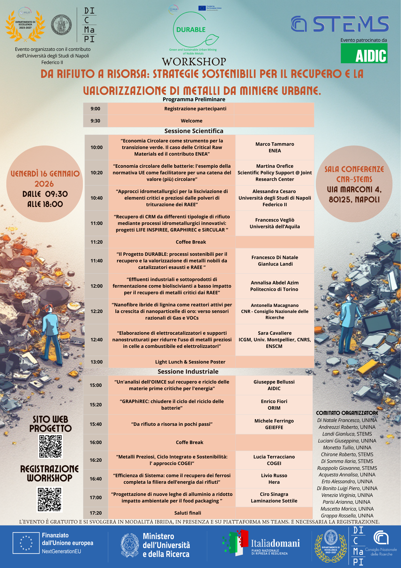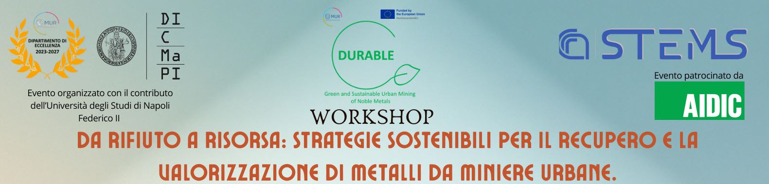 Il Workshop “Da rifiuto a risorsa: strategie sostenibili per il recupero e la valorizzazione di metalli da miniere urbane” rappresenta l’evento di disseminazione conclusivo del progetto PRIN-PNRR DURABLE. Il progetto DURABLE ambisce a proporre soluzioni tecnologiche più sostenibili per il recupero e la valorizzazione di metalli nobili da catalizzatori esausti e RAEE, nell’ottica di un approccio Safe and Sustainable by Design.Oltre a mostrare i risultati conseguiti nel corso del progetto DURABLE, il workshop coinvolge diversi speaker del mondo scientifico e industriale e intende presentare una panoramica dello scenario italiano sulle tecnologie di recupero di metalli da miniere urbane (catalizzatori esausti, RAEE, batterie etc.), con esempi di approcci industriali e di nuove applicazioni per i metalli recuperati.